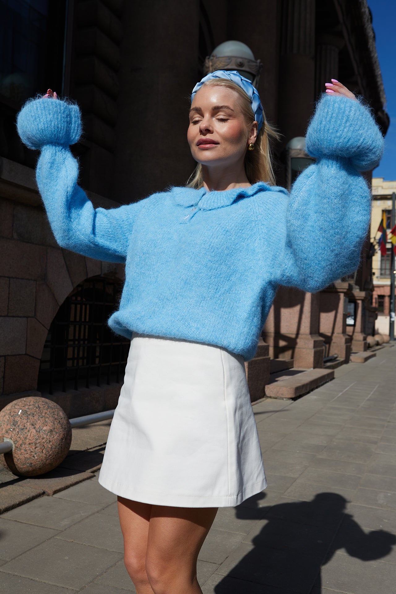 SKY BLUE megztinis - jaukus ir žaismingas megztinis su išskirtine apykakle bei rankogaliais. Giedro dangaus spalva ir audinio minkštumas leis jaustis gaiviai, patogiai ir stilingai.