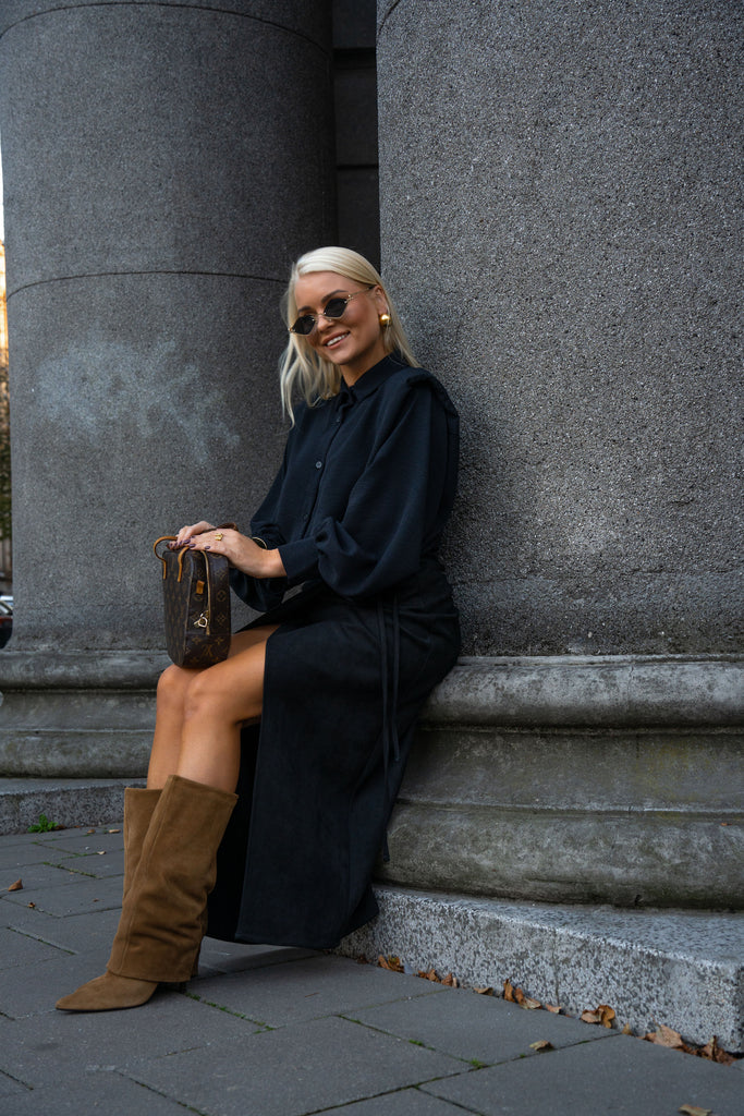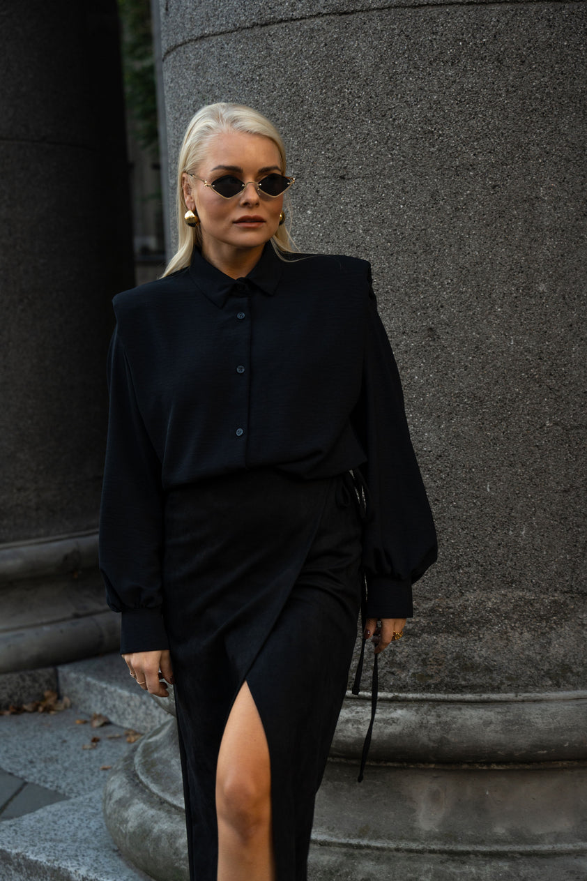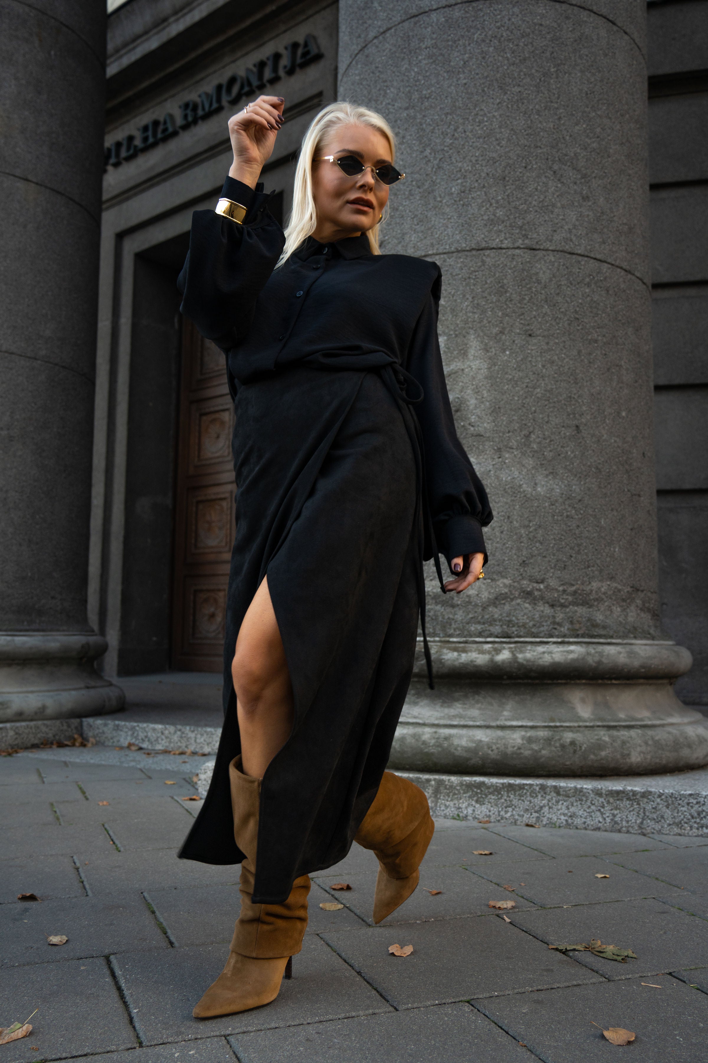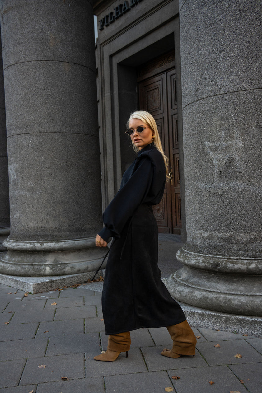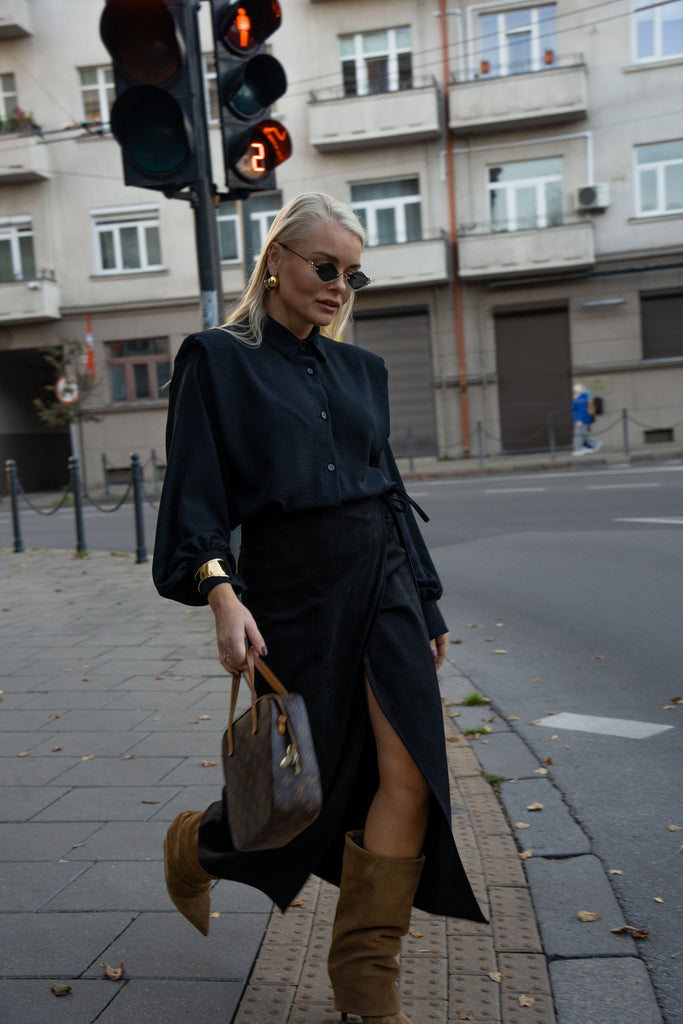 Rudeniui rinkitės zomšinį (eko verstos odos) susiaučiamą sijoną, kad perteiktumėte jaukią sezono estetiką. Eko odos sijonas puikiai dera su natūraliais rudens tonais, o ilgesnis siluetas bus puikus pasirinkimas krentant temperatūrai.
