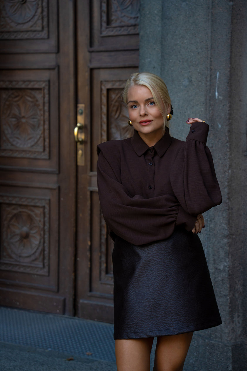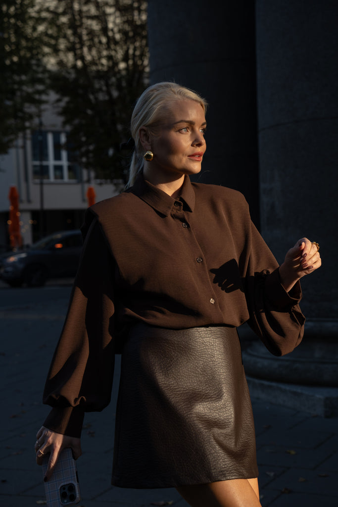 Rudeniui rinkitės eko odos mini sijoną, kad perteiktumėte jaukią sezono estetiką. Sijonas puikiai dera su natūraliais rudens tonais. Oda suteikia elegantišką įvaizdį, o mini ilgis leis kurtis stilingus derinius su pėdkelnėmis/kojinėmis bei suteiks žaismingumo
